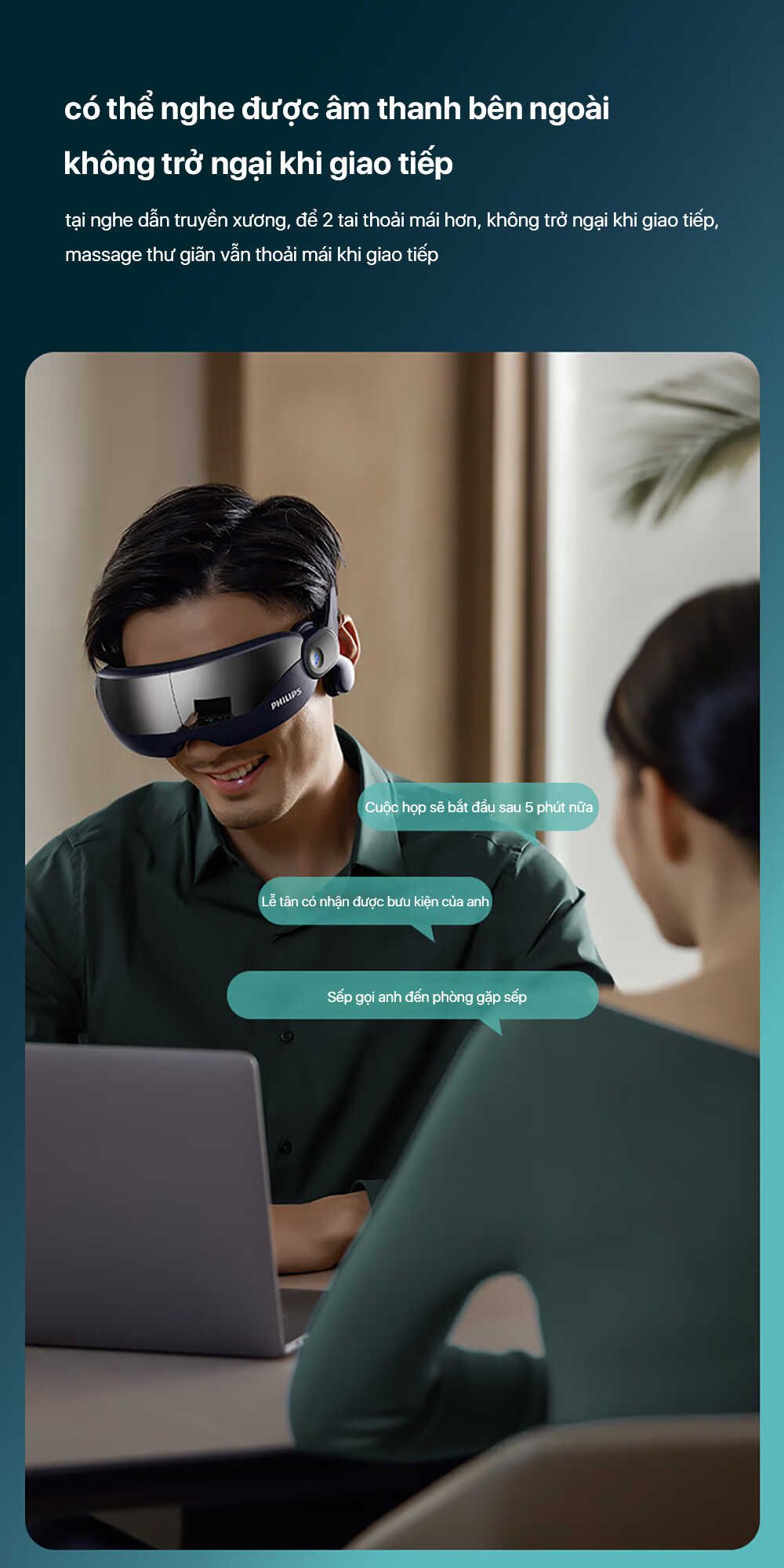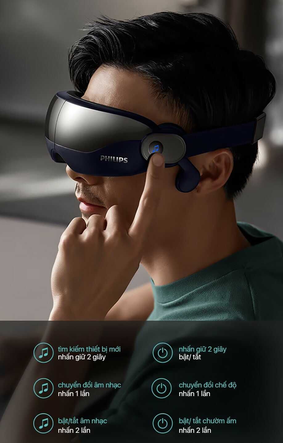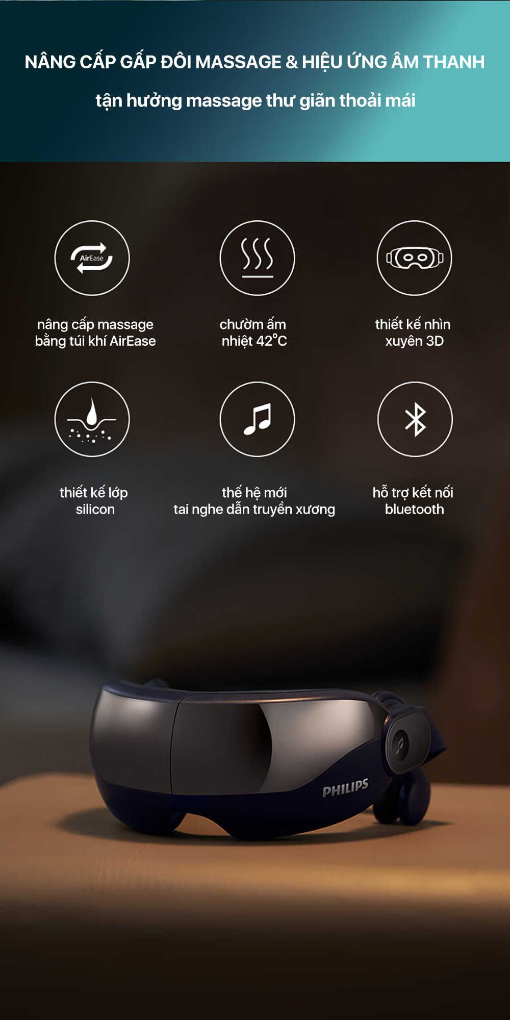 | Tiện ích | Túi khí 3D mát xa các huyệt mắt Dẫn truyền âm stereo qua xương Chườm nóng diện tích lớn Lớp lót da nano silicon |