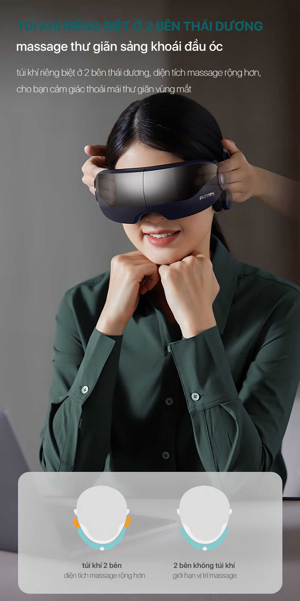 Hai bên túi khí chính là các túi khí phụ độc lập giúp xoa bóp thêm vùng thái dương với cường độ phù hợp. Với túi khí chính, máy có thể xoa bóp các huyệt quan trọng quanh mắt một cách toàn diện và chăm sóc tốt các huyệt quanh mắt.