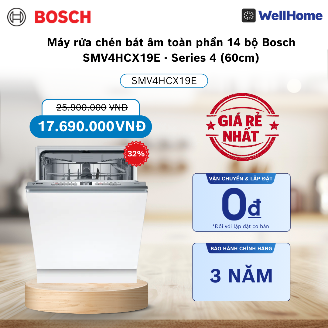 Bosch SMV4HCX19E Series 4 là lựa chọn tối ưu cho gia đình muốn tích hợp máy rửa chén ẩn hoàn toàn với dung tích lớn nhất và tính năng Half Load tiết kiệm. Với 14 bộ đồ ăn, khả năng tiêu thụ nước chỉ 9.0 lít và vận hành siêu êm, đây là khoản đầu tư thông minh giúp gia đình hiện đại vừa tối ưu thẩm mỹ tủ bếp, vừa tiết kiệm chi phí vận hành và nâng tầm chất lượng cuộc sống mỗi ngày.